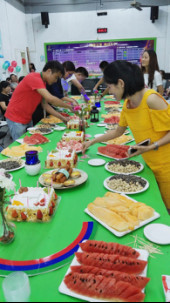 為員工慶祝生日是森榮手袋歷來已久的傳統(tǒng)安排,隨著企業(yè)一年一個臺階的上升,這個大家庭的人數也在不斷增加,每個季度的最后一個工作日,就是本季度所有壽星的生日。當天下午五點三十分,在生日快樂歌聲中,八十位壽星陸續(xù)走進會場,長桌上擺滿了為他們準備的精美食物,甜點水果零食小吃,應有盡有,色彩豐富,森榮設計師們把專業(yè)特點發(fā)揮到餐桌上時,也絲毫不顯生疏。